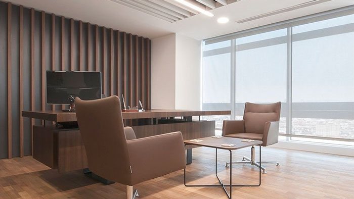 總經理辦公室的設計:此處采用極簡+新中式的設計手法,這也是設計師與總結里本人相互討論的結果,中式本身就是文化的一種濃縮,而中式本身對于心境的提升就很有好處,設計師希望中式可以提升總經理本人的心境,同時簡單的空間也為思考問題提供更多的可能性。