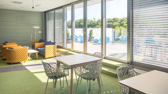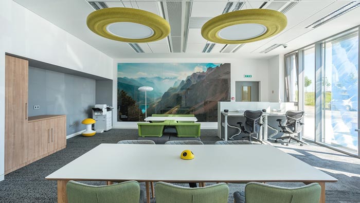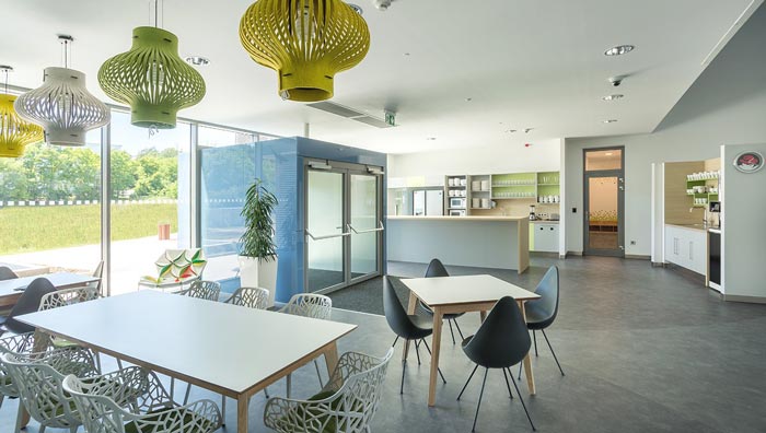 茶水間的設(shè)計:此處正對外界的草坪,陽光也明媚、充足,設(shè)計師希望給員工一個多功能的休息區(qū)域,既可以在室內(nèi)品嘗咖啡,又可以在草坪上玩耍,設(shè)計師希望室內(nèi)與室外之間的間隔,可以在這里打破,讓員工在辦公的中途,也可以接觸到外界的世界。