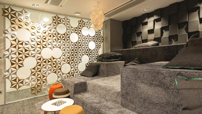 休息區(qū)域的設(shè)計:當員工勞累的時候,可以三五成群的在這里休息、聊天、玩鬧,在這里沒有任何束縛可言,設(shè)計師希望在這里讓員工感受到的是自由與輕松,在設(shè)計師看來技術(shù)型人才,在更多的時候需要的是自由,也只有這樣才能排解心中的壓抑。