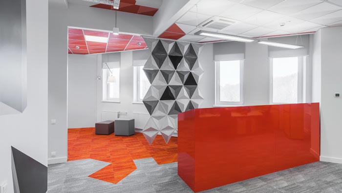 前臺接待區域的設計:此處與前臺區域相鄰,中間也沒有任何的阻擋,這也是設計師希望看到的,因為這樣一來兩個空間在某種情況來說,有一塊共用的區域,這樣一來兩個區域可以完美的融合在一起,我中有你、你中有我,讓空間更加的契合。