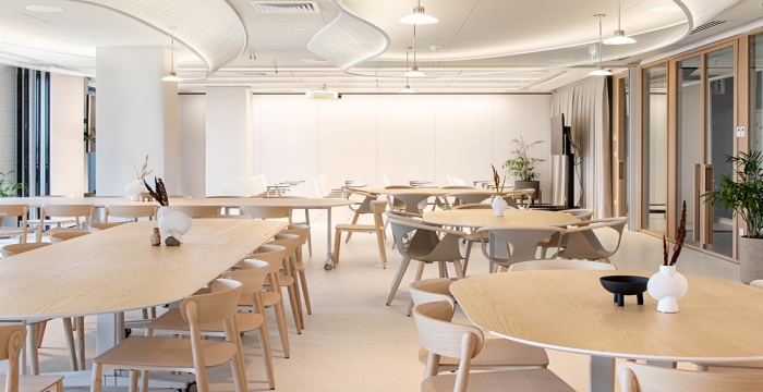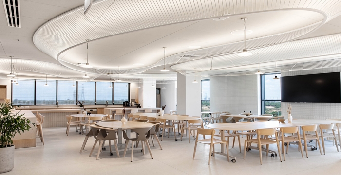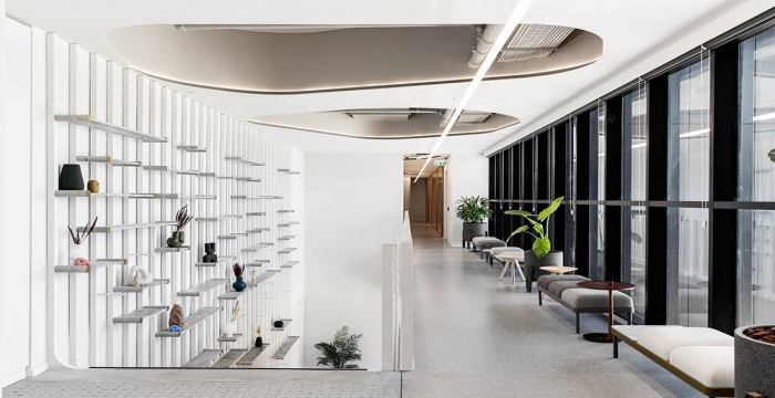 設(shè)計(jì)師將材質(zhì)、定制元素、形式和圖案組合賦予空間靈魂。最直觀的表達(dá)體現(xiàn)于室內(nèi)天花的構(gòu)造上,有機(jī)形式的開(kāi)放式天花設(shè)計(jì),局部裸露出頂面的管道機(jī)械系統(tǒng)。另一個(gè)就是位于餐廳的獨(dú)特頂面裝置,其形式來(lái)自于對(duì)四個(gè)心腔輪廓的模擬。這組三維裝置強(qiáng)化了客戶的行業(yè)屬性和奮斗的目標(biāo),為空間帶來(lái)與眾不同的體驗(yàn)。