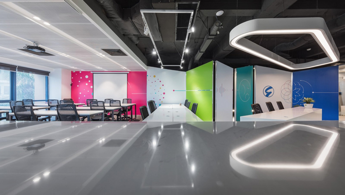 會議室的設(shè)計:此處就是剛剛大會議室與小會議結(jié)合的空間,在這里可以看出設(shè)計師對于設(shè)計的靈活使用,一個小小的轱轆讓整個設(shè)計都動了起來,設(shè)計師需要的就是這樣的效果,設(shè)計師希望讓設(shè)計活過來,讓企業(yè)對此處空間可以隨意的進行組合,達到高效辦公的初衷,這也是設(shè)計師給大家的意外之喜。