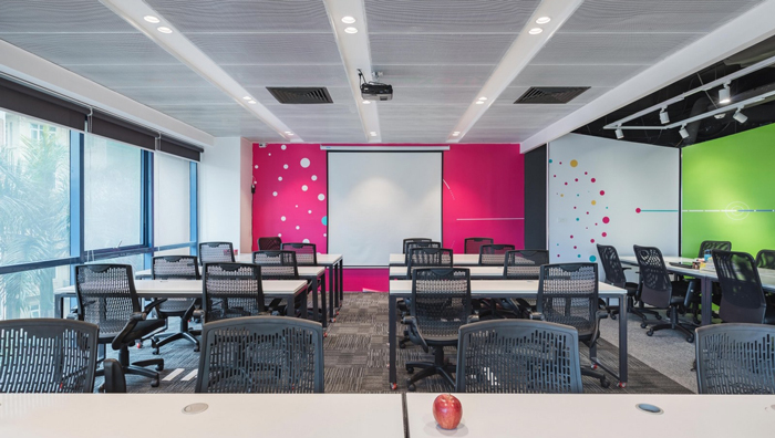 大會議室的設(shè)計:本次設(shè)計設(shè)計師參考了教室的布局模式,這也是設(shè)計師不得已而為之,由于空間的面積十分有限,故此設(shè)計師只能采用比較保守的設(shè)計,以此設(shè)計可以順利的進行下去,同時設(shè)計師在原有的基礎(chǔ)上,增加了自己對于光學的認識,目的就是希望在保守之際,為空間帶來一絲生機。