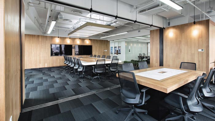會議室的設計:設計師在設計的時候,打算設計一個小會議室與小會議室結(jié)合的會議空間,大會議室安置在空間的內(nèi)部,小會議室安置在空間的外側(cè),兩者之間呈一條直線分布,這樣布局的好處就是為空間預留了足夠的活動空間,活動空間與動線相互結(jié)合在一起,既保證了空間的通暢又保證了空間的正常運行。