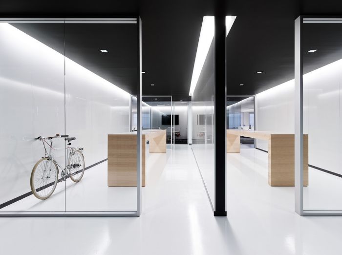 這是一個擁有800方的辦公室,辦公空間簡潔大氣。設計師打造了一個開放協作的工作環境包括工作場所、會議區、冥想空間、休閑區和私人電話亭。門口的存儲區可以放置自行車,鼓勵員工騎自行車上下班。