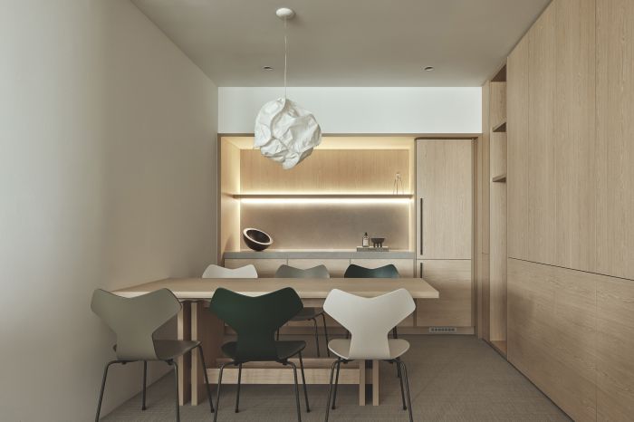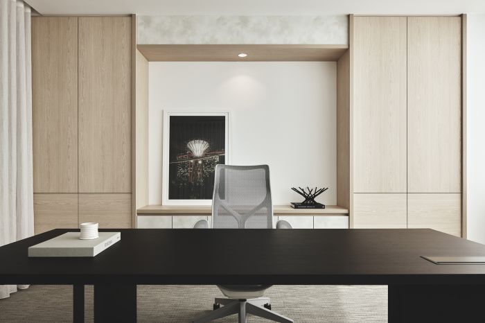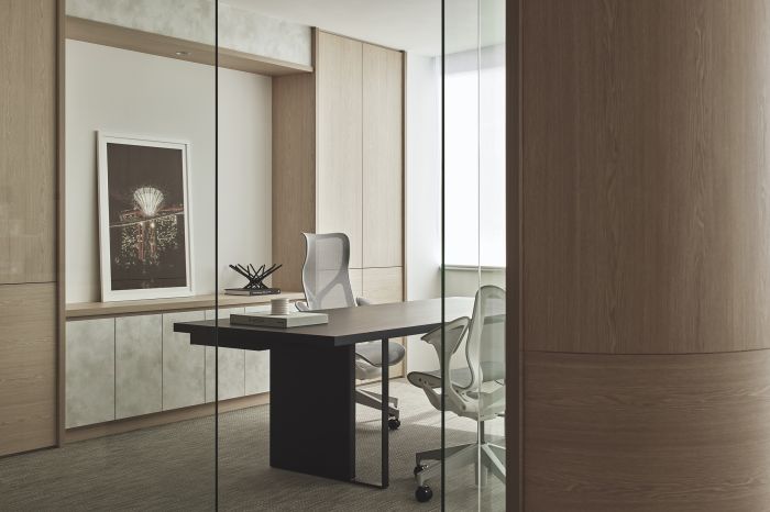 這是一個冷淡風的辦公室,辦公空間從入口到室內內部,每一個元素都給用戶提供了一種幸福和平靜的感覺。空間內部整體為開放式辦公室,區域或者隔間中使用百葉窗和藤條屏風進行分隔。