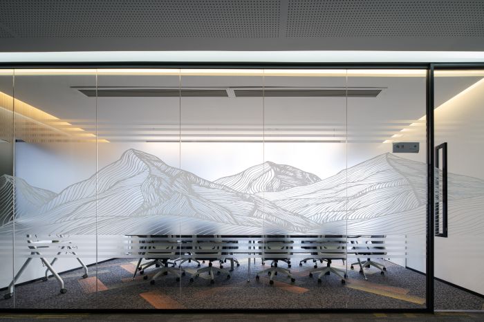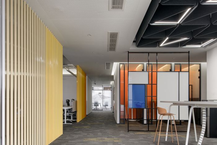 空間的一角設(shè)置有員工休息區(qū),員工可以在這個空間里休息和討論,桌椅的不同組合讓這個空間也可以作為大型培訓(xùn)的場所。空間內(nèi)有一個橙色的V字,是對空間原有建筑的延續(xù),使得整個空間靈動。