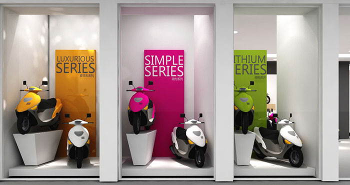 設(shè)計理念:設(shè)計師在設(shè)計之初,首先考慮到就是顧客見到店面的第一感覺。因為顧客進(jìn)到店面之后第一眼看到的就是電動車烤漆的顏色,這樣就會直接影響到顧客的第一眼感覺。設(shè)計師在設(shè)計的時候都會盡最大的努力把顏色作為重要的考慮。把顏色盡最大化的展現(xiàn)出來,讓白天陽光照射下來之后,會感覺到漆面顏色亮麗出彩,這樣就可以盡最大努力的讓用戶來的第一眼就對店面有一個很直觀的看法,可以贏得用戶的好印象。
