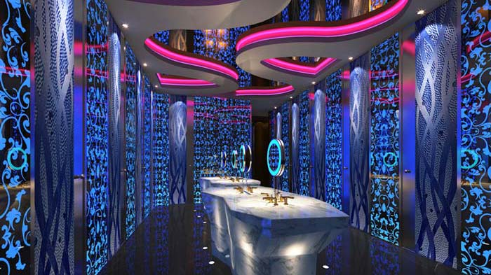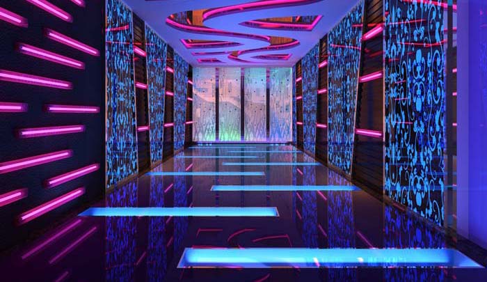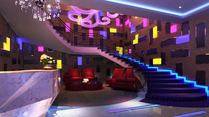 通往大堂的過道,地面抬高,也用了內(nèi)嵌LED燈管的做法,整個酒吧在設(shè)計中就能呈現(xiàn)出一片熱熱鬧鬧的感覺。