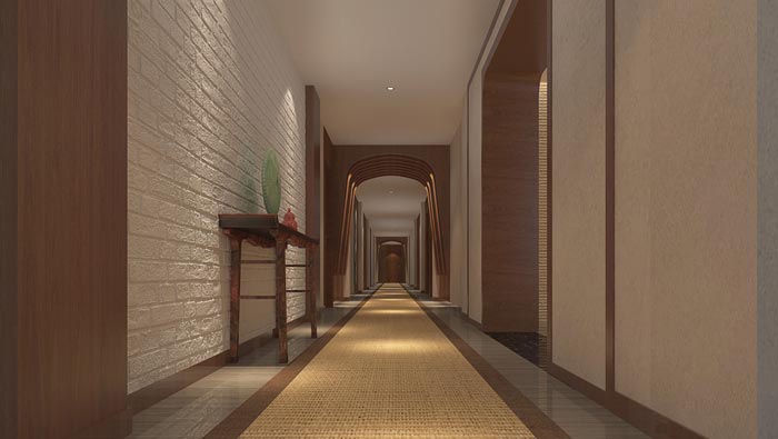 走廊的設(shè)計:經(jīng)過前臺客戶通過走廊進(jìn)入客房,在空間的作用上走廊起到連接兩個空間的作用,這樣的空間給了設(shè)計師很大的發(fā)揮空間,首先就是地毯的設(shè)計與選擇,土黃色的地毯與深色的外延,讓人感受到貴賓一樣的待遇,好似古代達(dá)官貴人出行紅地毯鋪路的場景,同時在空間意境的感染下,讓客戶的心得以靜下來,去聆聽空間的故事。