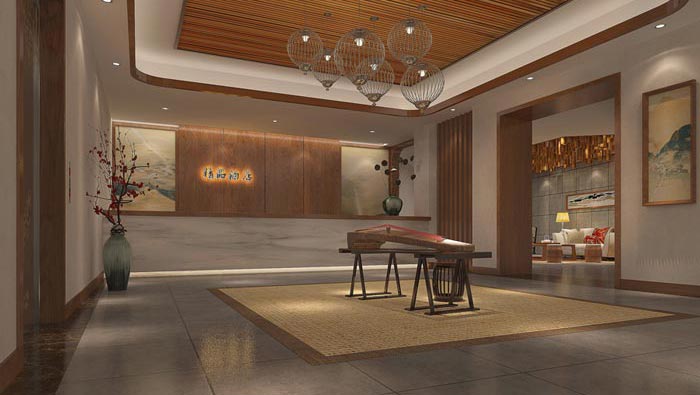 前臺區域的設計:客戶進入后會發現整個空間宛若一體,這也是中式風格特有的氣質,因為中式風格重在強調個體與整體之間的關系,并從中尋找到相互的關聯,古箏被設計師放置在空間的正中央,白天琴聲悠揚,讓客戶聞聲進入酒店之內去傾聽,這也是酒店的一大特色。