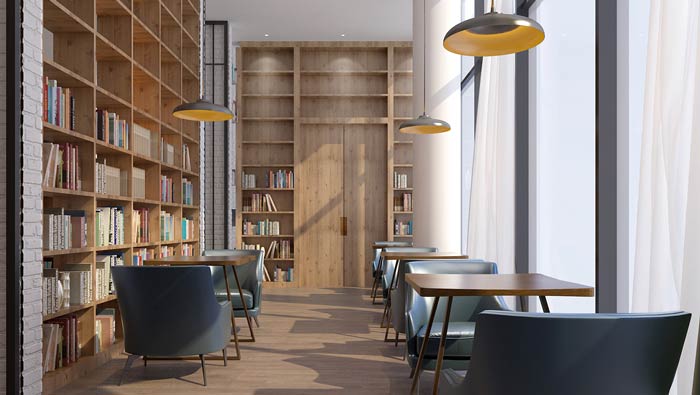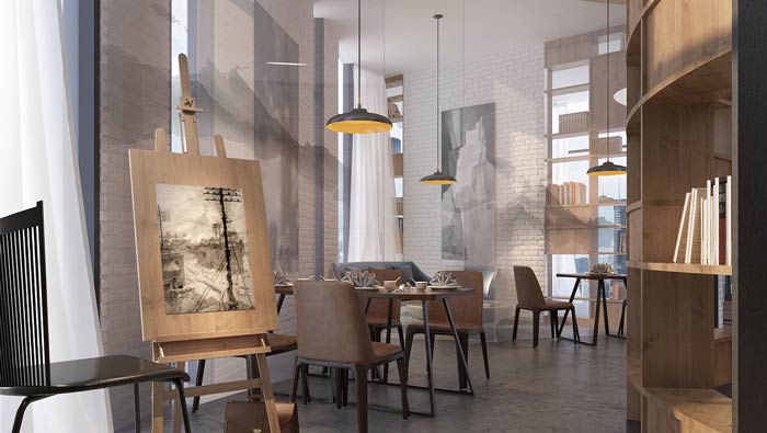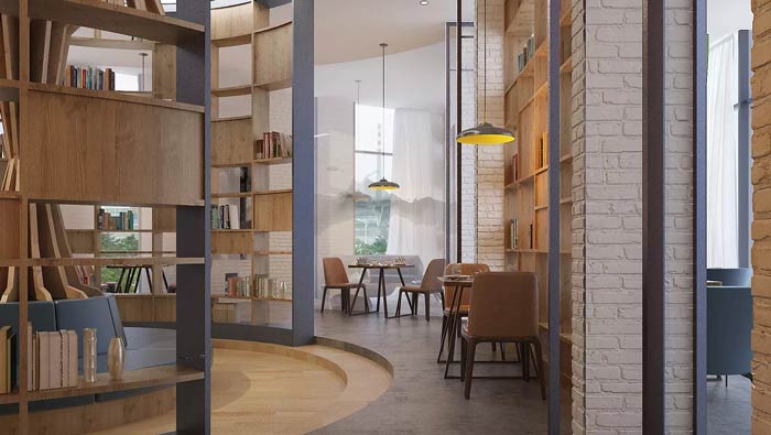 咖啡廳過道裝修設(shè)計:過道在這里不僅起到連接的作用,同時設(shè)計師也賦予了其接待、休息的屬性,桌椅擺放在過道的外緣,以此滿足客戶在空間中的休息與閱讀。