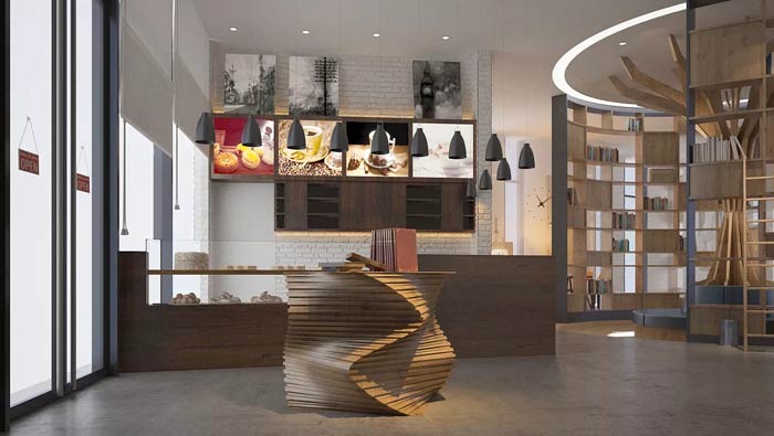 咖啡廳前臺裝修設(shè)計:異形吧臺、展示柜、展示牌、燈飾構(gòu)成整個前臺空間,客戶進(jìn)入后在這里可以選擇自己喜歡的飲料,在展示柜可以挑選自己喜歡的甜食,簡單、明了是第一原則。
