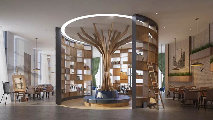 咖啡廳閱讀室裝修設(shè)計:兩個半圓圍繞而成的閱讀區(qū)域,兩個半圓以圖書架的方式出現(xiàn),既起到阻隔空間的作用,同時也起到擺放書籍的作用,客戶在這里可以享受到暫時的寧靜。