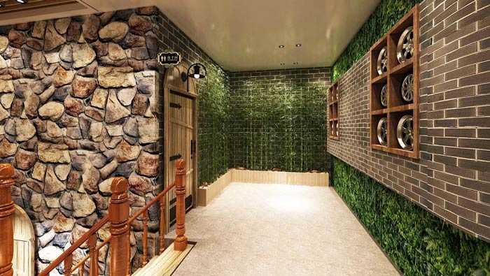 中式快餐店衛生間設計:綠色成為此處空間的第一色彩,這樣設計是為了弱化衛生間的存在,同時也希望打造一個優質的空間氛圍,讓客戶在這里享受到不一樣的就餐環境。