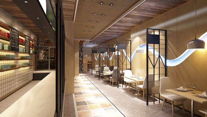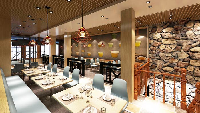 中式快餐店二樓裝飾設計:二樓給人的第一感覺就是井然有序,在這樣的空間中就餐,對于客戶來說也是一種享受,設計師希望在細節上,打造屬于快餐廳自身的特色。