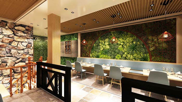 中式快餐店二樓餐區設計:二樓餐區主要以4人桌、6人桌構成,餐桌與餐桌之前可以拼湊,這樣既能滿足常規的需求,同時也能滿足非常規的需求,二樓的景色以綠色為主。
