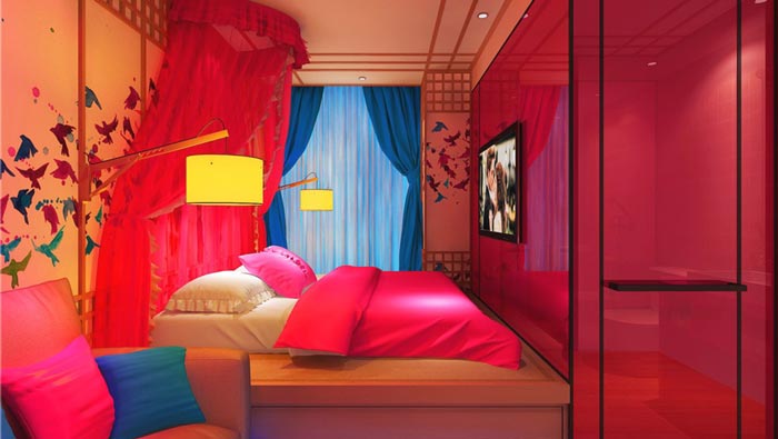 Hello Kitty客房的設計:此處給大家帶來的場景就是一個少女的心,設計師希望在這里,讓女孩子想起自己少女年代的美好畫面,讓男孩子可以走進女孩子的心中,讓雙方彼此的感情更進一步,在這里彼此的感情會經過不斷的發酵,進入一個新的階段。