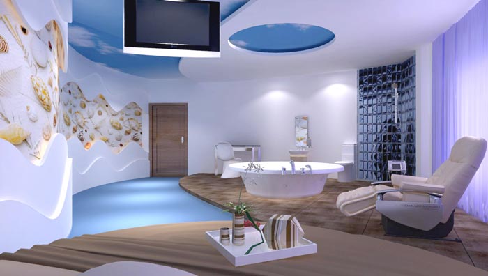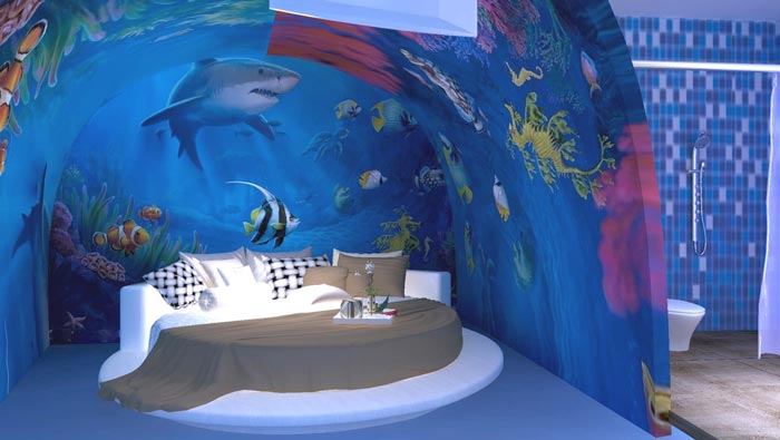 海底客房的設(shè)計(jì):在此次戀人們仿佛變成了無(wú)憂無(wú)慮的魚兒,去探險(xiǎn)那未知的海底世界,在這里他們會(huì)見(jiàn)到千奇百怪的海底生物,設(shè)計(jì)師希望讓他們,在這里來(lái)一次十分有意義的旅行,以此填補(bǔ)人們對(duì)于海底世界的無(wú)知,給戀人們一個(gè)美好的旅行,屬于兩個(gè)人之間的秘密。
