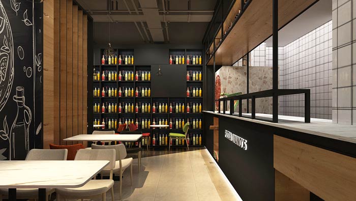 主題西餐廳進門區(qū)裝修設計:進門左側(cè)是吧臺,這是展示著各式各樣的披薩,將披薩放在空間的進門區(qū)域,是希望讓客戶在進門的第一瞬間,就被餐廳的美食所吸引。