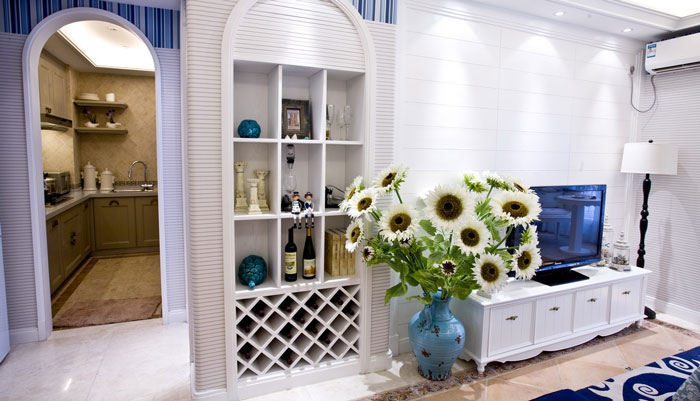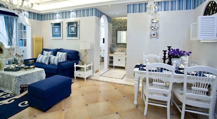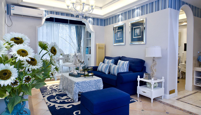 多以藍(lán)白色調(diào)為主,空間布置中加入海洋類裝飾物件,如帆船貝殼之類,地中海風(fēng)格客廳中條紋沙發(fā)占有主要點(diǎn)綴作用。
