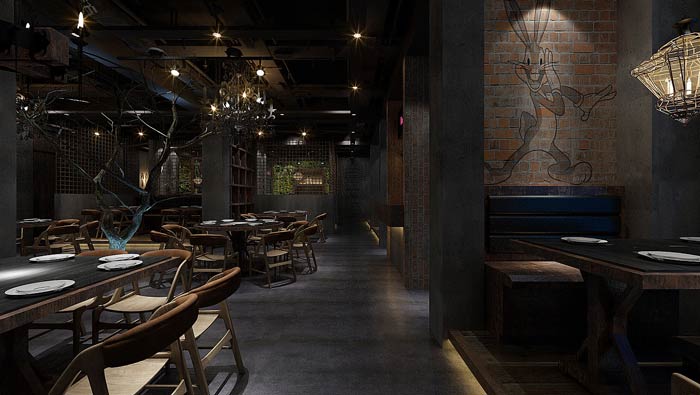 特色主題餐廳大廳設計:柔弱的燈光讓整個空間安靜了下來,這里沒有快速、沒有煩惱、沒有焦躁,有的只是一種消失已久的慢生活,在這里客戶的一切都慢了下來。